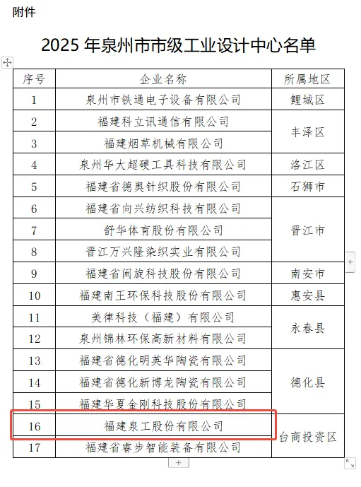 Наскоро Бюрото за промишленост и информационни технологии на град Куанджоу официално публикува „Известие за публикуване на списъка на центровете за индустриален дизайн на ниво град Куанджоу през 2025 г.“, с общо 17 предприятия, изброени в града. Сред тях Fujian Quangong Co., Ltd., която е дълбоко ангажирана в областта на интелигентните машини за тухли и оборудването за цялостно оползотворяване на твърди отпадъци, беше успешно избрана заради изключителното си представяне в иновациите в индустриалния дизайн, изграждането на системи за изследване и развитие и трансформацията на постиженията.
