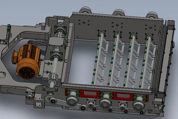6Електрически задвижван люлеещ се дъгообразен подавач на основата (по избор) Електрически задвижвани; греблото за счупване на арката се люлее под определен ъгъл около вала, за да разхлаби материала.